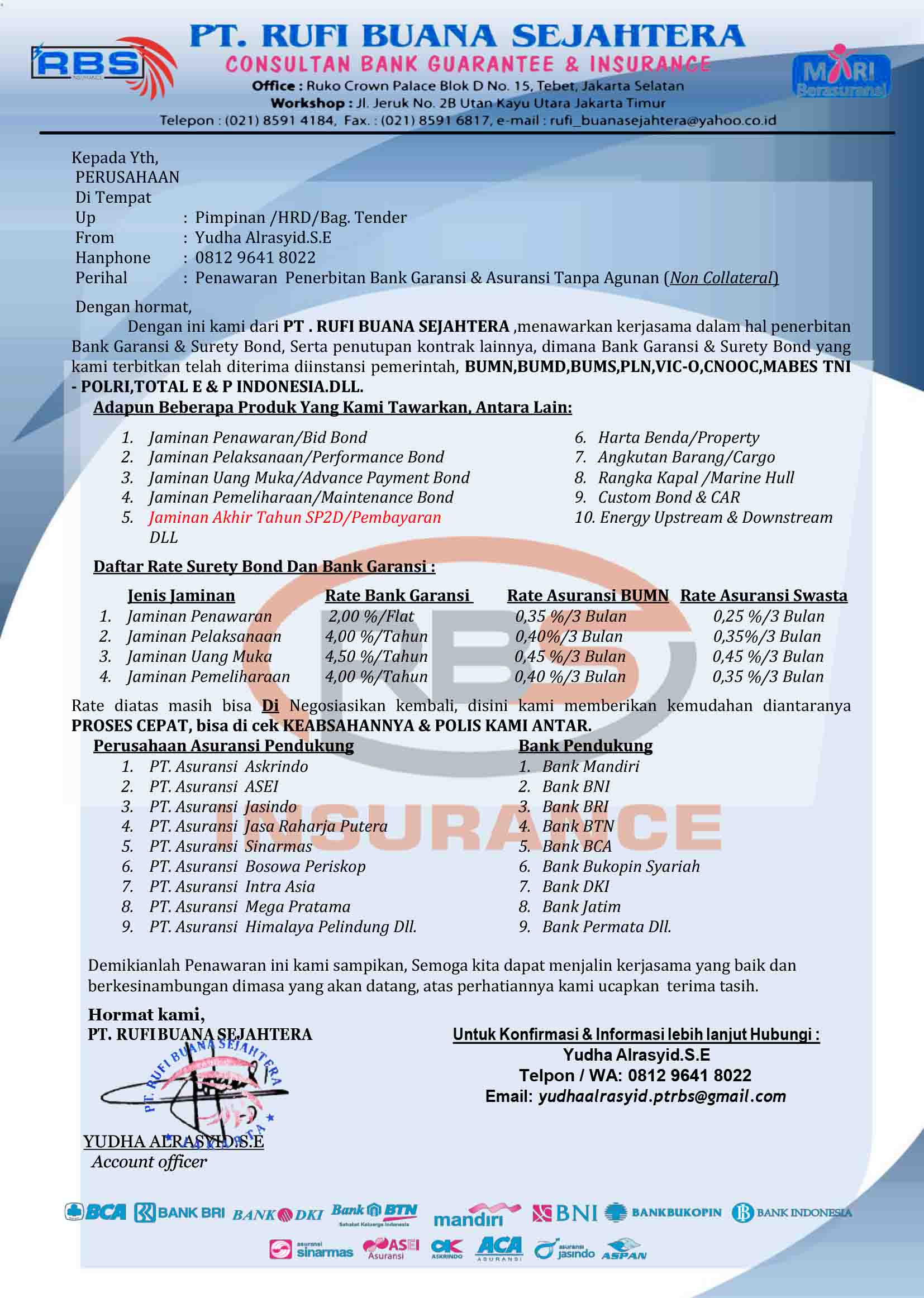 Perkenalkan kami Dari PT. RUFI BUANA SEJAHTERA Dimana Perusahaan Kami Bermaksud Menawarkan Penerbitan Jaminan Bank Garansi & Surety Bond Bisa Tanpa Agunan (Non Collateral), Proses Cepat dan Mudah, Adapun Jaminan Bank garansi & Asuransi Yang Kami Tawarkan Telah Diterima di instansi Pemerintah dan Swasta serta sudah terdaftar di Otoritas Jasa Keuangan (OJK)