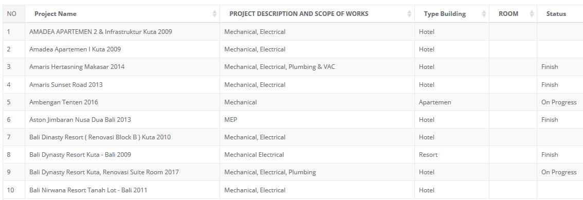 Sebagai kontraktor MEP Hotel, Villa & Restauran, perusahaan ini juga merupakan Anggota Asosiasi Kontraktor Listrik dan Mechanical Indonesia(AKLI), Asosiasi Tenaga Ahli Konstruksi Indonesia(ATAKI) dan Gabungan Perusahaan Konstruksi Nasional Indonesia(GAPEKSINDO)